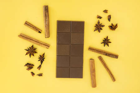 Top view. Chocolate bar. Dark chocolate on a dark background with spices. Anise.
