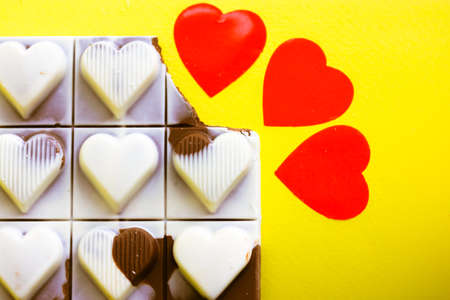 Milky dark chocolate bar with hearts on each slice top view on yellow background. World Chocolate Day. Sweet, calorie, unhealthy food. Valentine's day and love concept. Red decorative hearts flat lay.