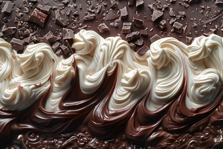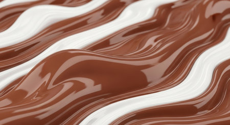 Close up view of swirling melted milk chocolate and white chocolate creating a glossy, wavy, and delicious abstract pattern. Ideal for food, dessert, or confectionery themes.