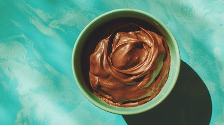 Delicious overhead view of smooth chocolate mousse in green bowl on textured surface