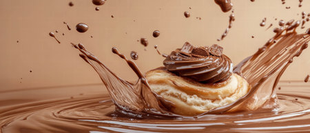 Delightful chocolate milk splash with a cinnamon roll on a creamy backdrop