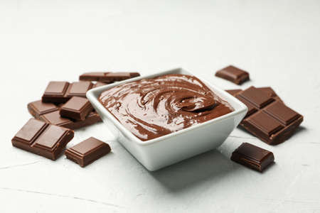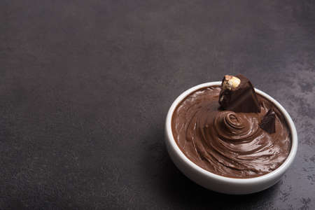 Sweet chocolate cream with bars and nuts on a stone table. Dessert homemade ingredient.