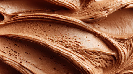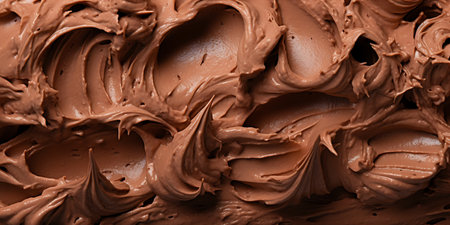 A close-up image showcasing the rich and smooth texture of chocolate frosting, featuring beautiful waves and swirls. Ideal for baking and dessert inspiration.