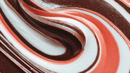 This image showcases a vibrant swirl of rich chocolate and creamy strawberry, perfect for dessert inspiration, culinary creations, or food styling.