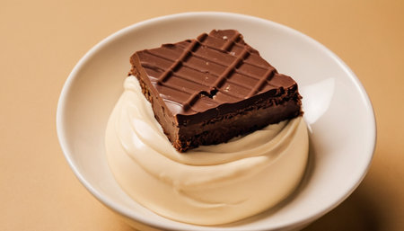 chocolate cake with cream on a white plate on a brown background