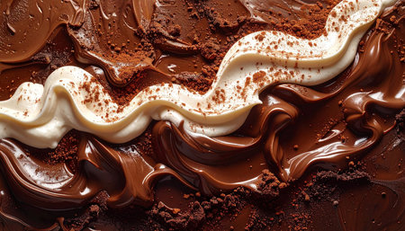 Close-up view of rich, creamy chocolate swirls on a dark cocoa surface, showcasing alluring textures and a glossy finish perfect for culinary inspiration.