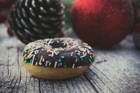 homemade sweet donuts with Christmas decorations, on a wooden board