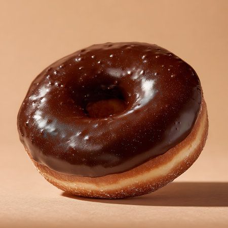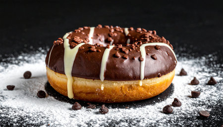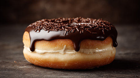 Tempting view of a fresh donut with a luscious chocolate glaze and sprinkled topping, sitting on a textured surface. The donut features creamy filling, inviting indulgence.
