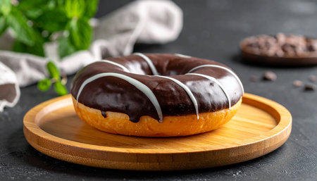 A chocolate frosted donut with white icing drizzle is placed on a wooden plate with fresh mint leaves in the background.