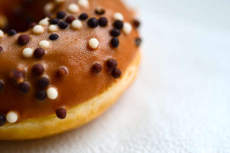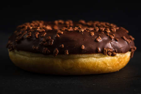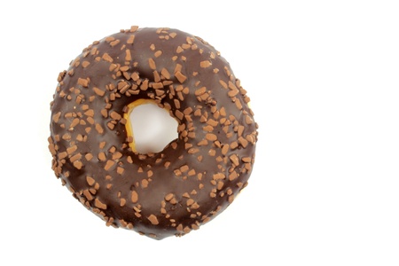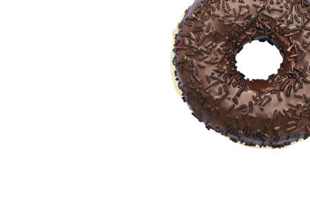 Chocolate glazed donut with chocolate chips isolated. Close up of delicious donut.