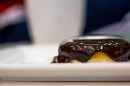 Chocolate glazed doughnut on white plate with coffee in the background