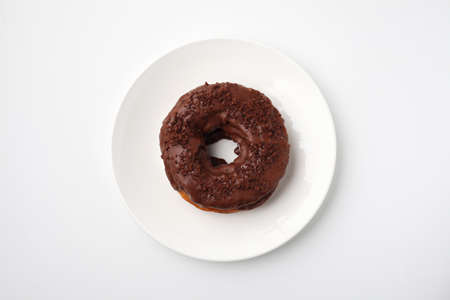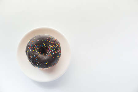 Donut with chocolate glaze on a white background, top view