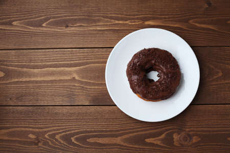One donut in chocolate glaze on wooden background