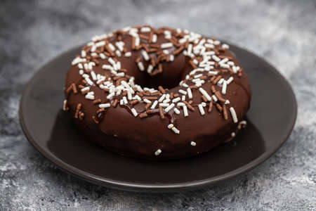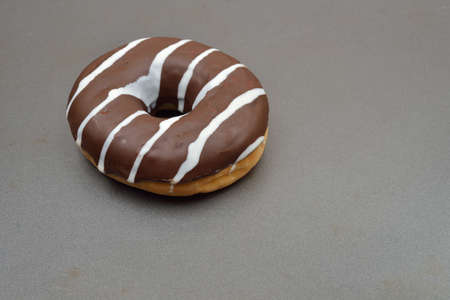 Chocolate donut with stripes on gray background. Sweets. Selective focus