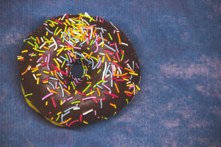 Chocolate donut on a dark blue background close-up copy space