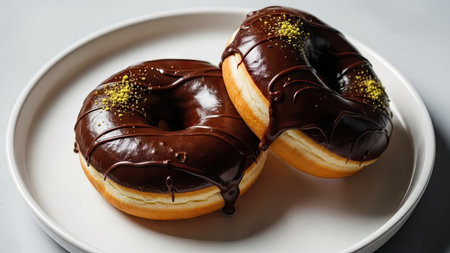 Two doughnuts with rich chocolate glaze sit on a white plate. Their golden-brown base contrasts with the dark, glossy topping. Soft lighting highlights the textures, suggesting a fresh, appetizing treat. Suitable for culinary, advertising, and editorial content related to food and indulgence.