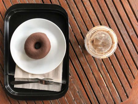 Chocolate dougnuts served with iced coffee on wood table