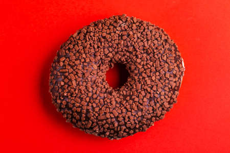 Delicious chocolate donut with sprinkle on bright red background. Unhealthy, but tasty sweets. Copy space. Top view