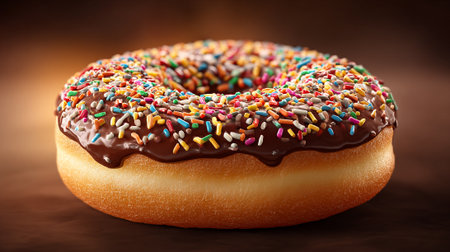 A tempting doughnut is glazed with chocolate frosting and topped with colorful sprinkles. The dessert is set against a solid brown background, highlighting its delectable appearance.