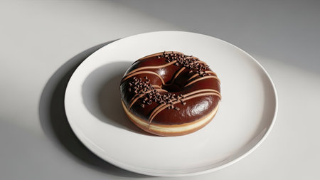 A close-up captures a chocolate donut on a white plate. The donut features a glossy chocolate glaze with decorative stripes and sprinkles. The composition emphasizes the dessert against a neutral background. This image is suitable for food-related marketing and editorial content. The lighting is soft and even, highlighting the texture.
