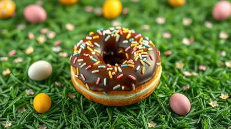 Delicious chocolate donut decorated with sprinkles on grass surrounded by colorful Easter eggs