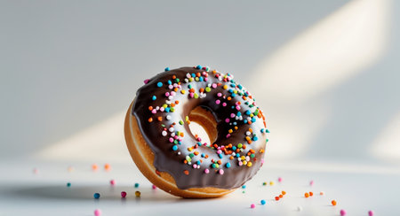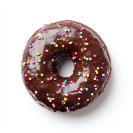This delightful chocolate donut topped with colorful sprinkles sits against a clean white background, perfect for any food or bakery project.