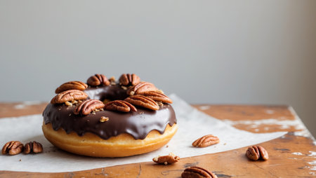 AI Generated. Delicious Chocolate Donut with Pecan Nuts on Rustic Wooden Table