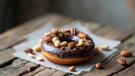 AI Generated. Delicious Chocolate Donut with Assorted Nuts on Rustic Wooden Table