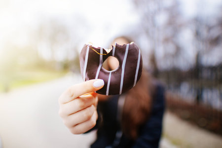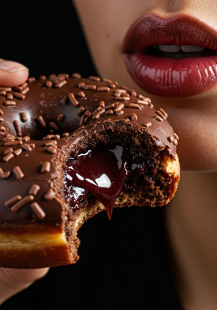 Close up view of a woman holding a bitten chocolate donut with sweet filling dripping out. Delicious dessert for World Chocolate Day concept.