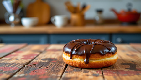 a single chocolate donut with chocolate icing and chocolate drizzle placed on a surface that appears to be a table or kitchen countertop. the background includes a kitchen setting with wooden surfaces, cooking utensils, and various kitchen items visible such as pots and pans. there is no text present in the image. the style of the photograph is straightforward, focusing on the subject with a shallow depth of field that makes the donut the clear focal point.