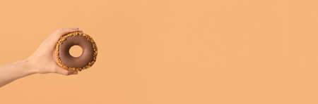 Hand holding tasty donut on color background with space for text