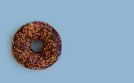 Close up of classic chocolate donut on blue modern background. copy-space