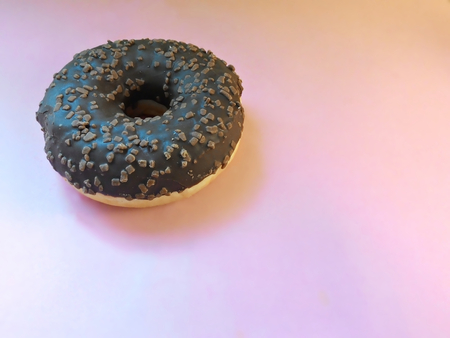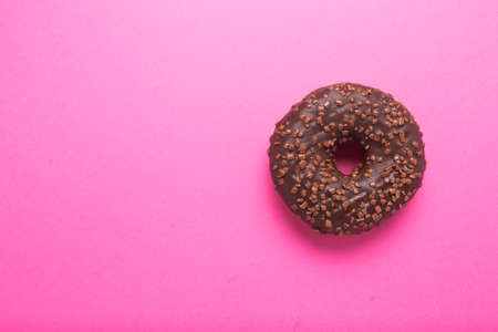 Chocolate donut on a pink background close-up.