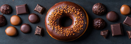Chocolate Donut with Sprinkles Surrounded by Various Chocolates on a Dark Background, Top View