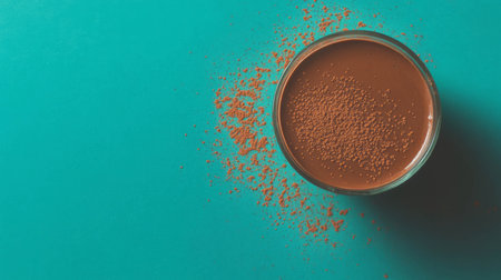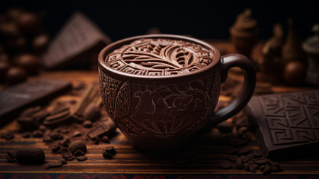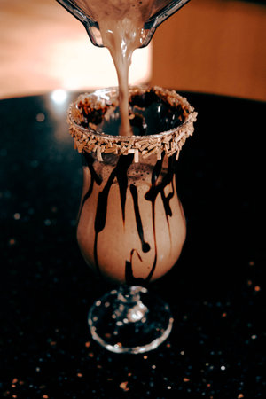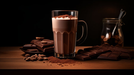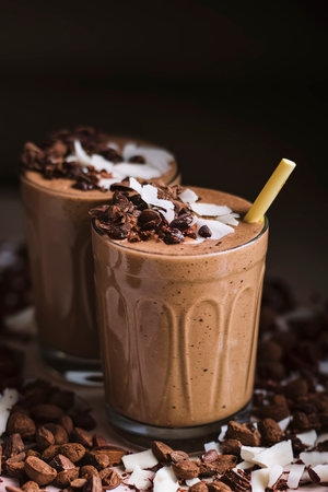 chocolate milk smoothie cup with chocolate nuts and cocoa powder on a tabletop. this photo, captured in the style of hasselblad h6d-400c and nikon d750, showcases the rich details and vibrant colors. the night photography technique, along with volumetric lighting, adds a touch of drama. the hyperrealistic rendering brings the image to life, making it a captivating visual experience. ai generated