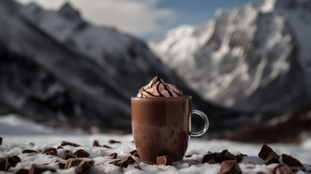 Cup of hot chocolate with marshmallow on snow and mountains background