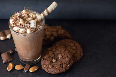 Cup of cocoa with marshmallows and chocolate chip cookies on dark background.