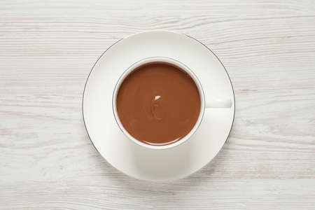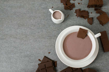 Hot chocolate in white ceramic mug and tablet and pieces on white table. Top view. Horizontal composition.