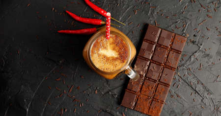 From above of glass jar with coffee and straw on table with bar of chocolate and chili pepper