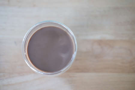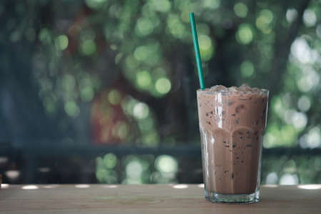 Iced chocolate in clear glass showing the texture chocolate sauce mix milk and refreshing look of the drink
