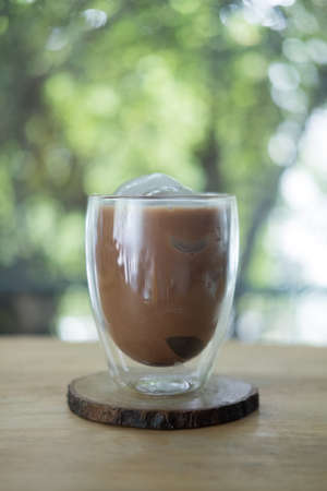 Iced mocha coffee served in the designed double-wall glass at coffee cafe. Look delicious, concept of coffee break time. Chilling and relax.