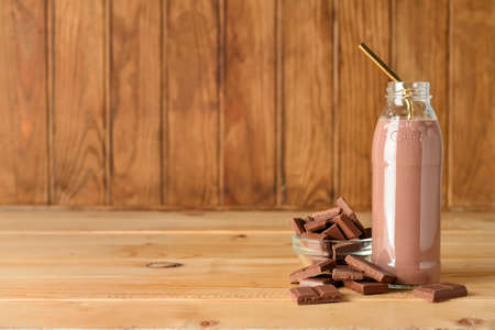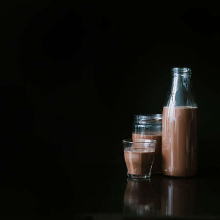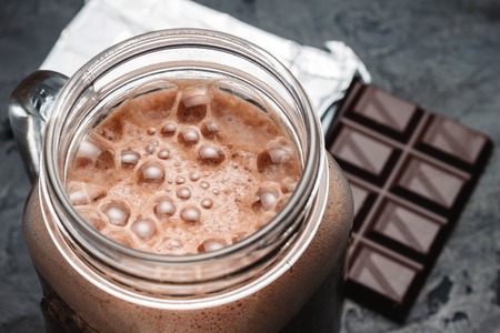 Chocolate smoothie in a jar, protein milkshake, healthy eating on dark background.