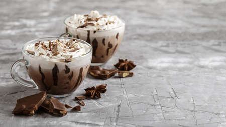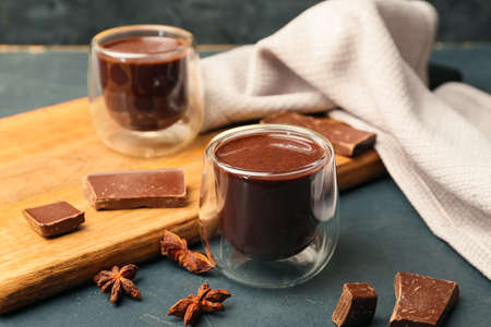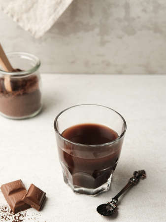 A glass of hot chocolate and pieces of chocolate on grey background. Selective focus image and blurred background.