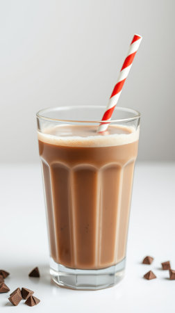 Chocolate milkshake with striped straw in a clear glass against a neutral background