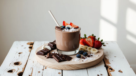 AI Generated. Delicious chocolate banana smoothie topped with fruit and chocolate pieces on a rustic table