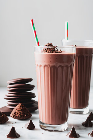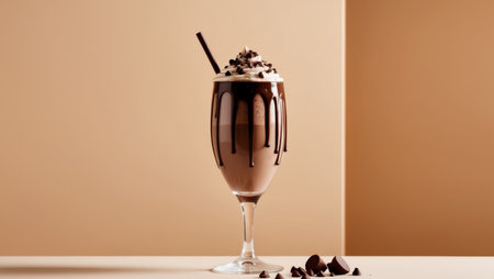 AI Generated. Delicious chocolate milkshake served in a tall glass with chocolate drizzle and garnished with chocolate chips on a warm background