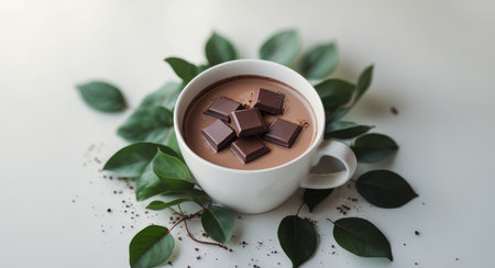 AI Generated. Cozy Cup of Hot Chocolate with Chocolate Squares and Green Leaves Surrounding on a Bright Surface for a Warm and Inviting Atmosphere
