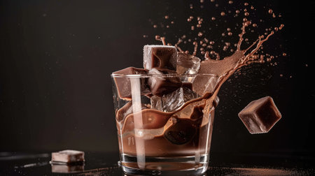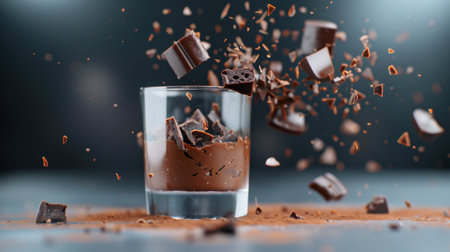 A stunning capture of a chocolate dessert presented in a glass, featuring scattered pieces and cocoa powder, showcasing motion and indulgence in culinary art.