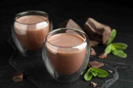 Glasses of delicious hot chocolate, chunks and fresh mint on black table