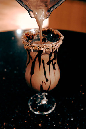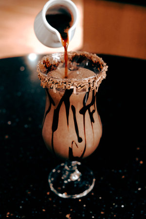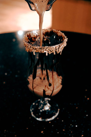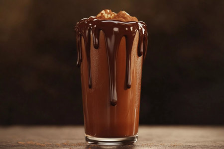 Indulge in the luxurious sight of molten chocolate glistening as it drips captivatingly down the sides of a glass. This decadent treat invites sweet anticipation and blissful enjoyment.